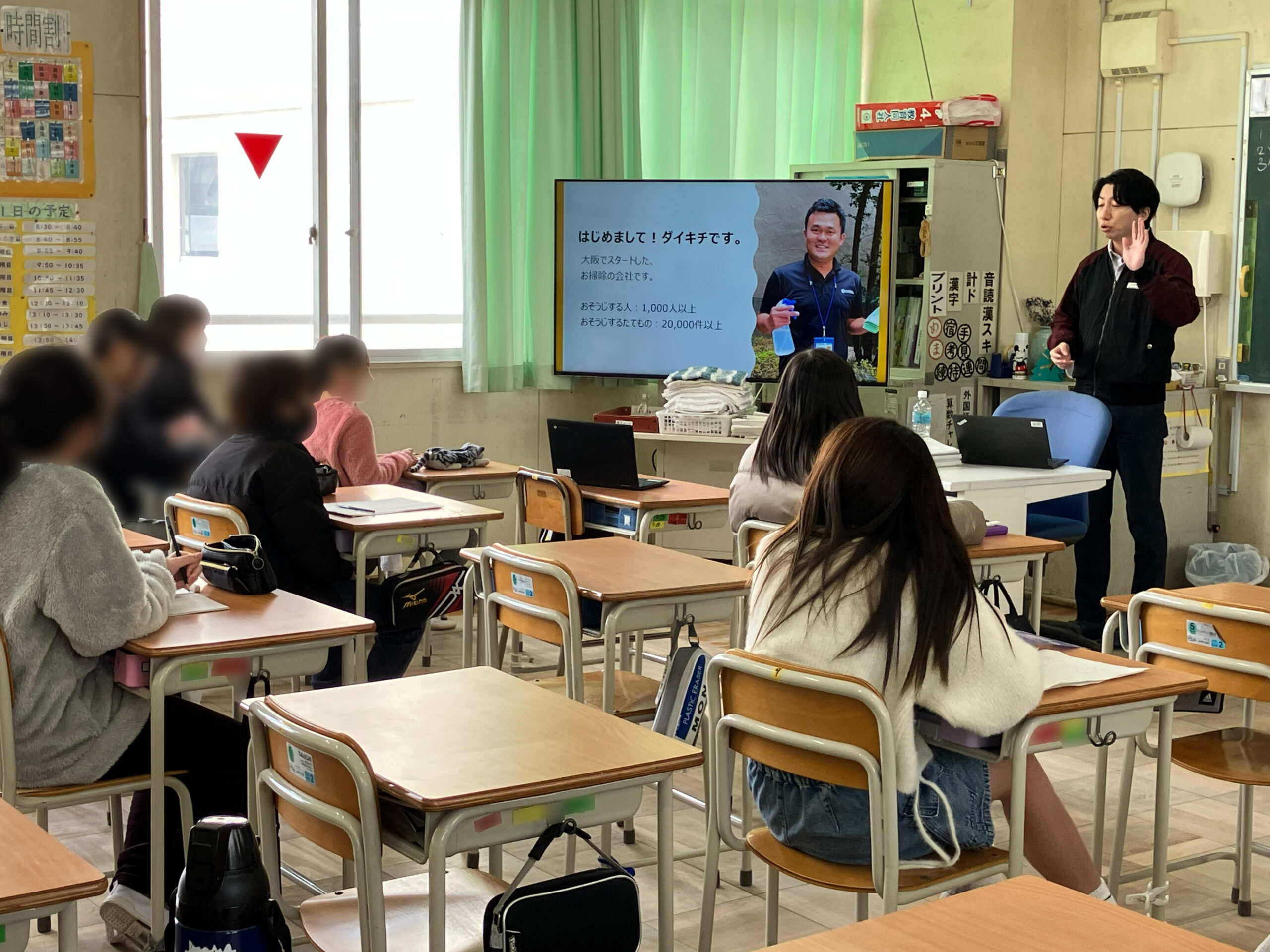 小学校の「企業連携」という取り組みで、他社さんも来られて各教室に分かれ、小学生たちが希望の教室の授業を聞くものでした。名のある企業さんが来られていて、カバーオールの掃除のお話を聞いてくれる子どもがどのぐらいいるのか、始まるまでわかりませんでしたが、20名弱の子ども達が聞きにくれて「将来の職業に掃除という選択肢も増えた」と言ってもらえました。